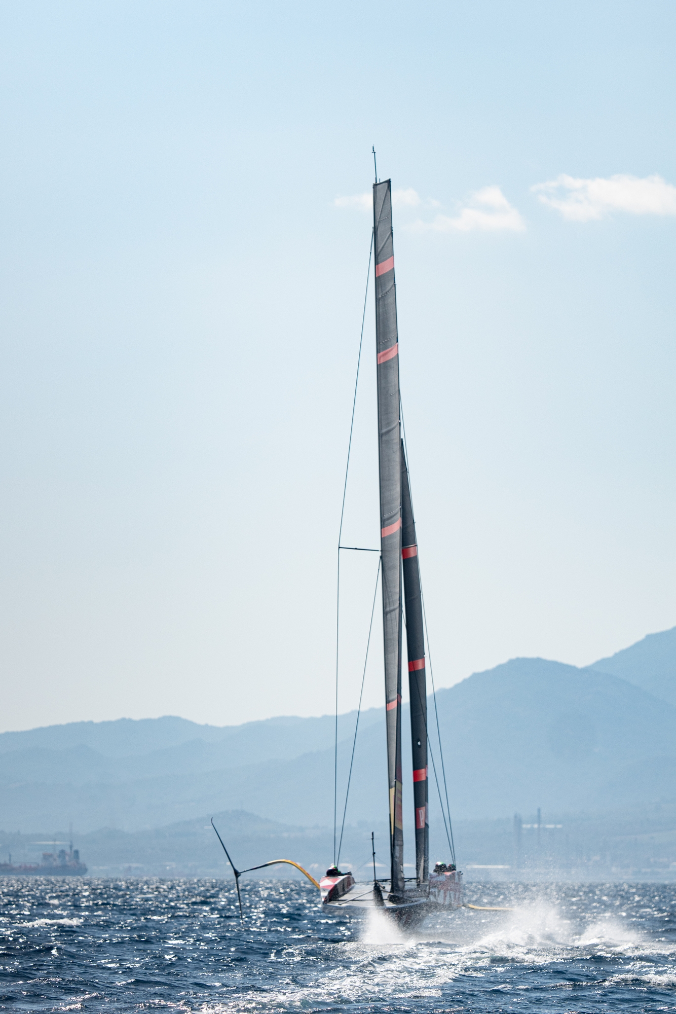 Andy Maloney, always the coolest of sailors, spoke afterwards and summed the day up perfectly: “It was another epic day here in Barcelona, flat water, nice building southerly breeze and you know just slowly going down the jib codes and just some really nice conditions to sail the boat…We’re always just checking in on that crossover but yeah going through quite a few codes today with that building southerly and just enjoying being back out in the AC75 in a bit more breeze, getting some higher boat speeds and just getting back dialled-in.”