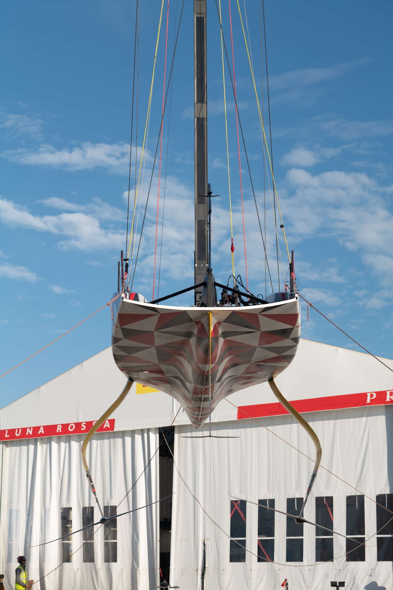 On-Water Recon Report – Luna Rossa Prada Pirelli: After two weeks spent in the shed, the Italian team rolled out their repaired LEQ12 prototype at 9:10, stepped mast and spent some time perhaps checking forestay load before craning the yacht in by 9:25.