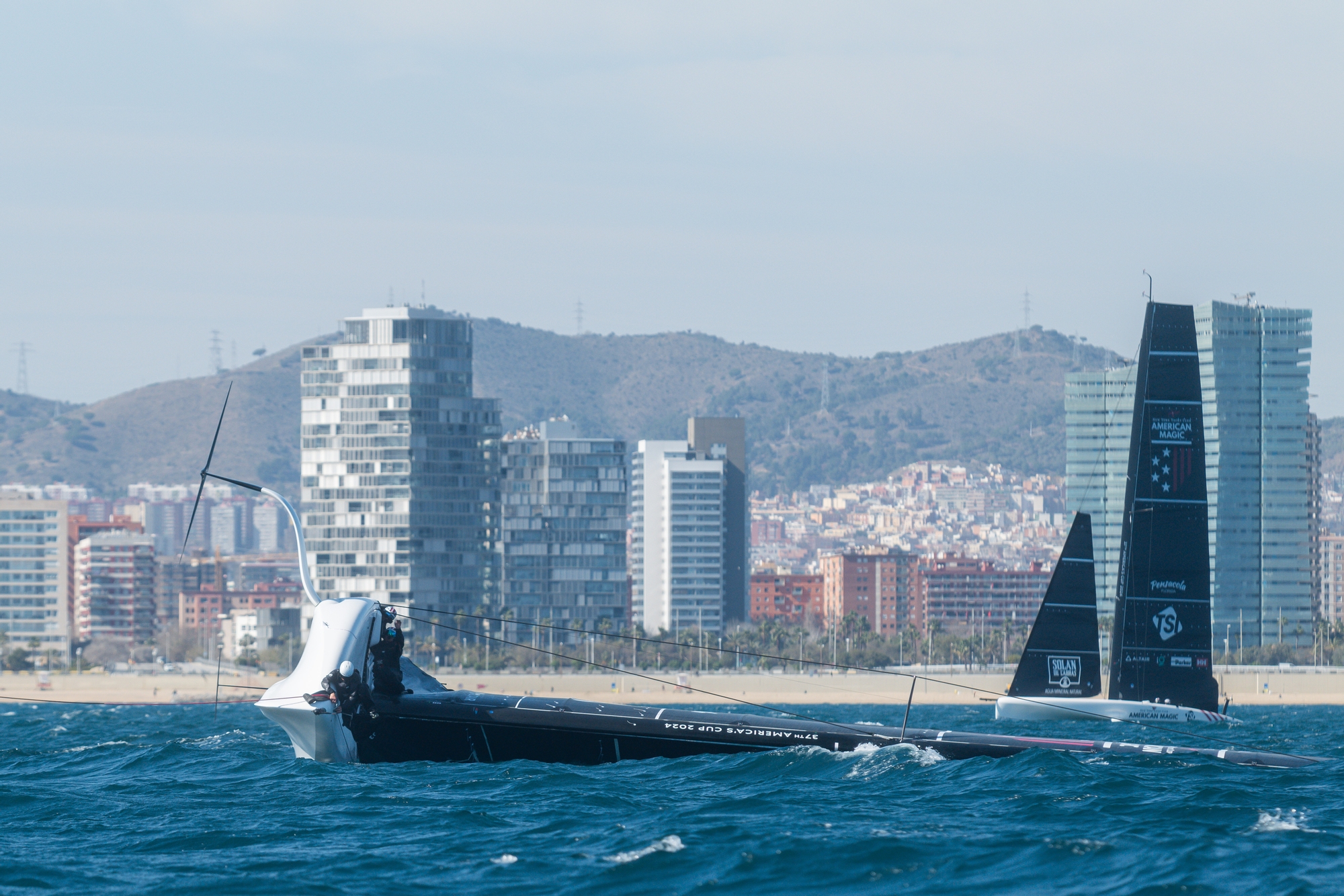 Stint 3 (14:35 to 16:20): Training race 2. As in the previous prestart America crossed the line first on starboard tack and Magic came in on port. Just after crossing the line, America gybed and it seemed (we had the focus on Magic at that moment) that she lost the rudder at some point, lost control and came off the foils and then started luffing upwind in slow motion with quite a lot of heel until they capsized. It took almost half an hour to the team to get the boat upright and when they did it was found that the boat was quite full of water and probably some systems were not working properly. They dropped the sails and worked on taking water out of the boat. Unfortunately, this meant the end of the sailing session for today.