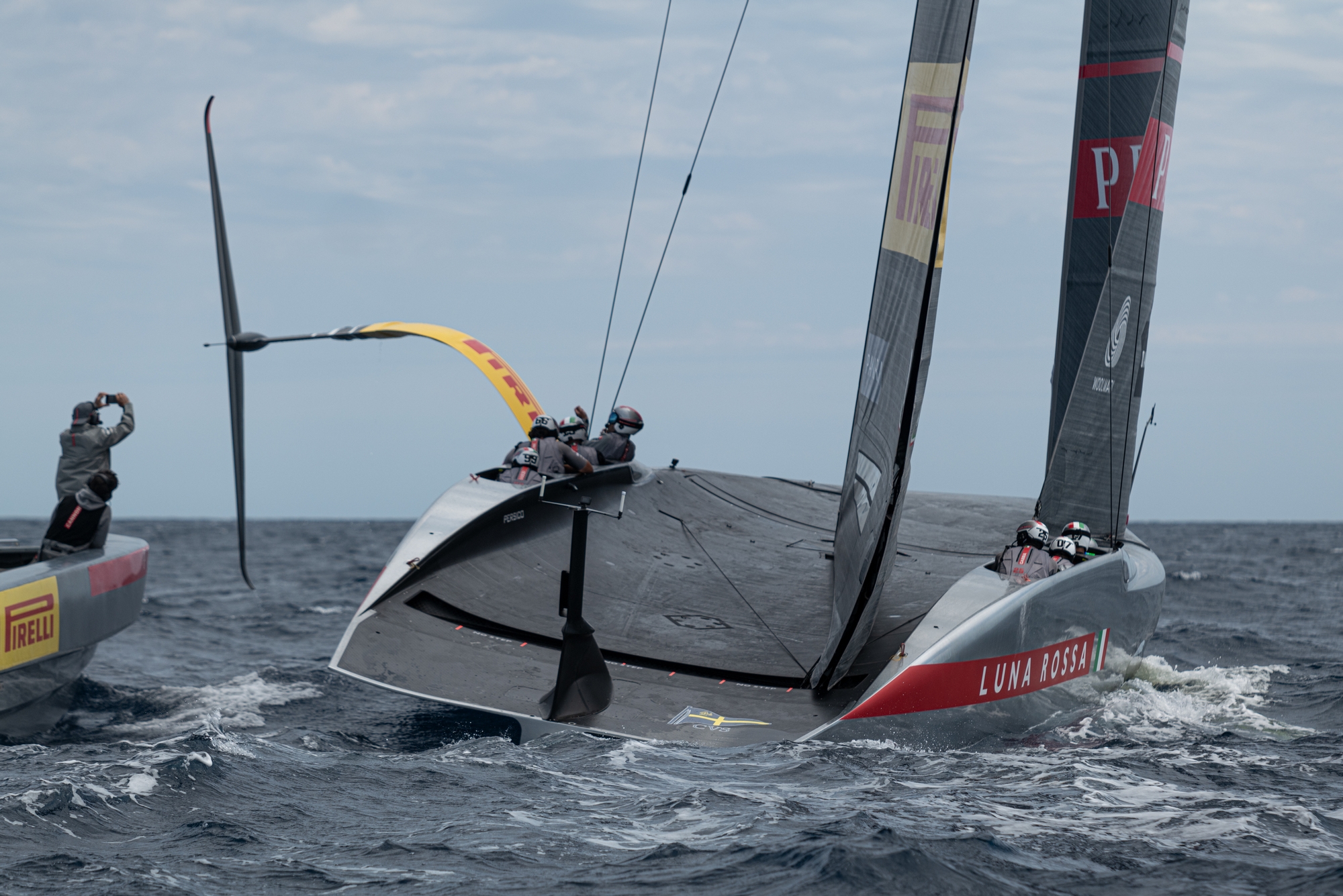 The impressive Italian challenge for the Louis Vuitton 37th America’s Cup stepped up a gear today with the first sailing session from their Port Vell base in Barcelona. Luna Rossa Prada Pirelli received a baptism of fire with the Barceloneta racecourse offering 12-16 knots of solid easterly breeze and a short chop – almost certainly what the design team had in mind when crafting a Barcelona-specific AC75. And in those prime conditions, the aesthetically stunning Luna Rossa bristled with outright power and pace.