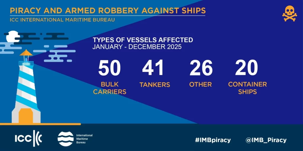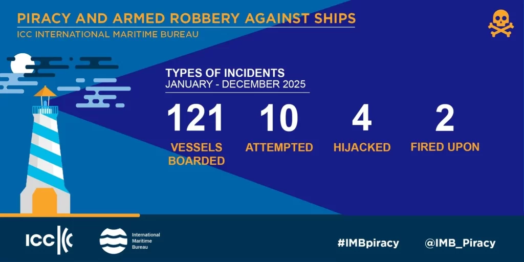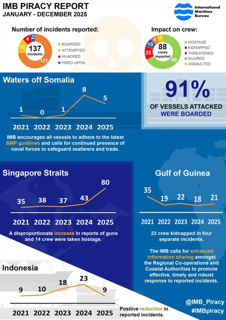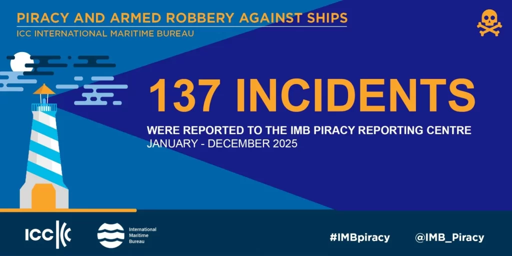 According to the IMB Annual Piracy and Armed Robbery Report 137 incidents against ships were recorded in 2025 compared to 116 in 2024 and 120 in 2023. It reveals that 121 vessels were boarded, four vessels were hijacked and two fired upon as well as 10 attempted attacks.